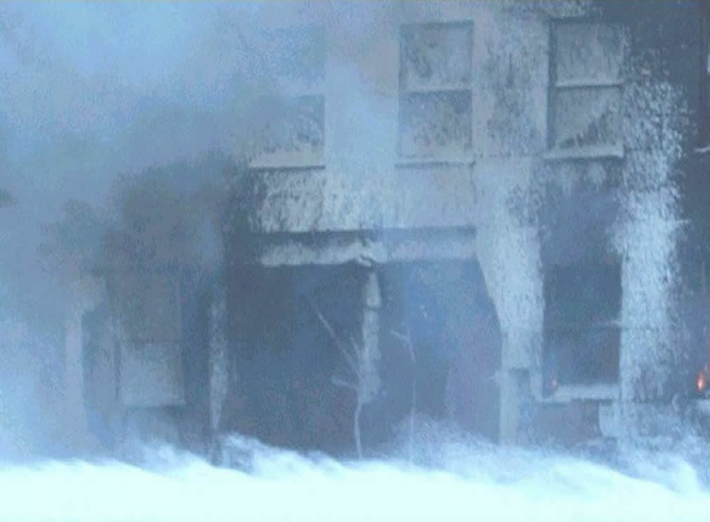 Le trou d'entrée dans la façade du "Boeing 757" : 4m de large, 3m de haut... Les fenêtres ne sont pas brisées (la mousse des pompiers ruisselle dessus)...