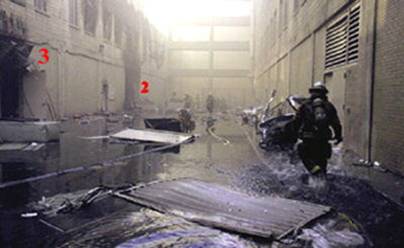 Une cour intérieure du Pentagone entre deux « anneaux » (le bâtiment en compte cinq) dans la zone du « crash » où l'on voit deux énormes trous dans le béton armé, qui ne sauraient en aucun cas correspondre à un « avion »...