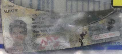 Un « papier d'identité » de l'un des supposés « pirates » du « vol 77 », Nawaf Alhazmi, prétendûment retrouvé dans les ruines du Pentagone. Le nom et la photo sont naturellement bien visibles ; il faut ce qu'il faut pour convaincre les indécis... Le même genre de faux, encore plus caricatural quant à la fabrication, sera retrouvé dans la terre à Shanksville, comme le fut, nous dit-on, le passeport de Satam Al Suqami dans une rue de Manhattan près du WTC après l'impact...