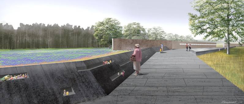 Le mémorial de Shanksville tel qu'il sera inauguré le 11 septembre 2011, pour le dixième anniversaire... En réalité, si, bien entendu, l'avion UAL 93 ne s'est pas planté dans le champ, il est bien possible que l'hommage s'adressera quand même à de vraies victimes, celles qui revenaient vers Washington avec le vol 93 et que les avions de chasse ont volontairement abattu en altitude pour terminer le scénario du 9/11...