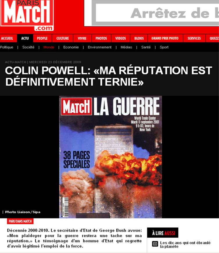 La confession de Colin Powell, Secrétaire d'Etat (Affaires étrangères) en fonction le 11/9/01 – et ancien chef d'état-major lors de la guerre du Golfe (1991) - au sujet de ces « armes de destruction massive »...