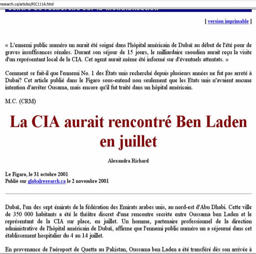 Le Figaro du 31 octobre 2001 rend compte de la visite faite à Ben Laden, hospitalisé à l'Hôpital américain de Dubaï, le 4 juillet 2001, deux mois avant les attentats, par le chef de poste de la CIA. Qui peut sérieusement croire que Ben Laden complotait en même temps le 11-septembre ?...