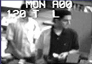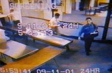 La célèbre photo de M. Atta et A. Alomari franchissant un contrôle de sécurité aéroportuaire. Nous sommes le 11septembre à Portland (Maine), à 170 km de Boston où ils doivent prendre le vol fatal AA 11 (départ prévu 7h45). Ils s'y sont rendus l'après-midi du 10, pour une raison « inconnue »... Il est 5h45 du matin, ils vont s'embarquer dans un petit Beechcraft de 20 places qui doit les conduire à Boston-Logan. Ils arriveront de justesse pour l'heure prévue de départ (on verra M. Atta courir)... |