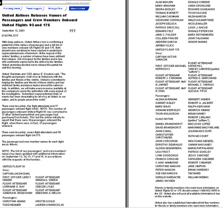 La liste officielle des passagers des vols 175 et 93 de United Airlines : aucun nom à consonance arabe, aucune trace des « pirates ». Cette liste est mise à jour au 18 septembre ; s'il manque un nom, c'est à la demande des familles, comme l'indique la compagnie (bien lire ce document FONDAMENTAL). Il est peu probable que les familles des supposés « pirates » aient demandé qu'on retire les noms de ceux-ci, n'est-ce pas ? Que 5 + 4 « pirates » se soient embarqués sous de faux noms est exclu, car tous les passagers sont répertoriés sur des sites in memoriam avec photos et biographies à l'appui, comme on peut le vérifier par ailleurs.