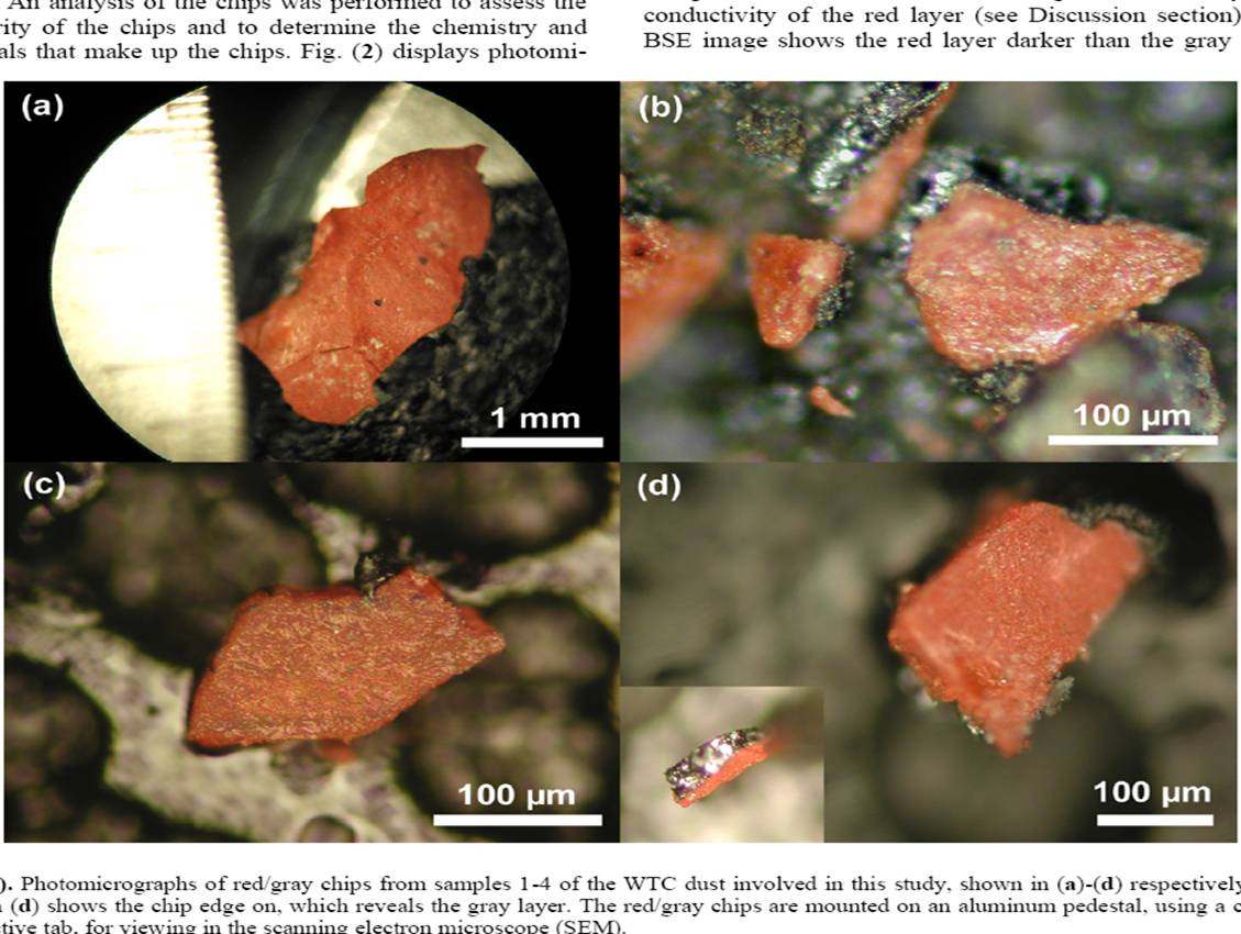Les minuscules particules de « nano-thermite » sans doute disposées dans les Tours (et l'immeuble WTC 7 ?) sous la forme de « peinture explosive », ce qui explique vraisemblablement les chantiers bruyants après lesquels plus rien n'était visible (cf témoignage de M. Scott Forbes dans les vidéos)