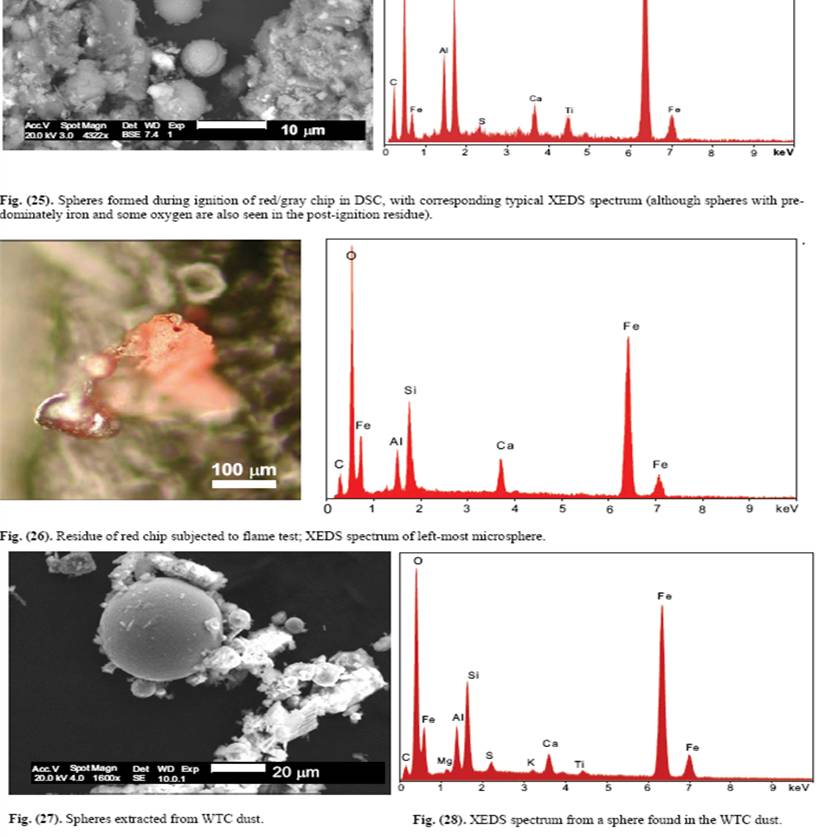 Les études de spectroscopie analysant la composition des « chips », avec, en microsopie électronique à balayage, la présence d'acier fondu (petites sphères) signant la réaction de la thermite avec le métal.