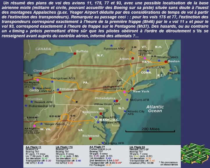 Voici les plans de vol prévus pour les quatre avions (en marron) et les trajets suivis par les « avions détournés » (en orange), ou plus exactement par les aéronefs qui en tiennent lieu... Deux vols (AA 11 et UAL 175) partent presque à la même heure de Boston-Logan pour Los Angeles, un vol part de Washington-Dulles pour Los Angeles (AA 77) et un vol part de New York-Newark pour San Francisco (UAL 93). On reviendra plus loin sur les informations contenues dans cette carte.