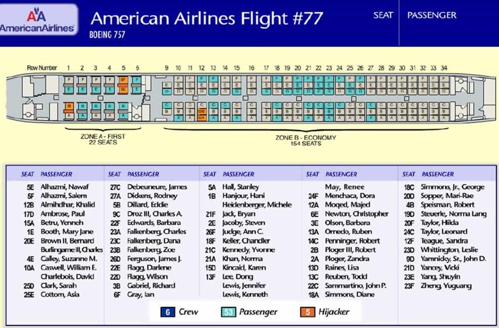 Le plan de cabine du vol American Airlines 77. Taux de remplissage : 53 passagers pour 176 sièges soit moins de 30% (52¨% en moyenne un mardi ordinaire...)